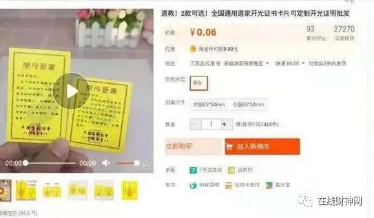 开光证就是骗人的废纸,上图是之前某淘宝店的开光证,单月销量近三万件,这还只是一个淘宝店的销售量。现在淘宝不给使用开光两个字,搜索不到了,以前在淘宝、京东、拼多多等搜索一下开光证,有众多的店铺都出售开光证书,任何人自己一块钱可以买一把开光证。普通人不知道,本身作为圈内人士肯定知道开光证就是骗人的把戏。