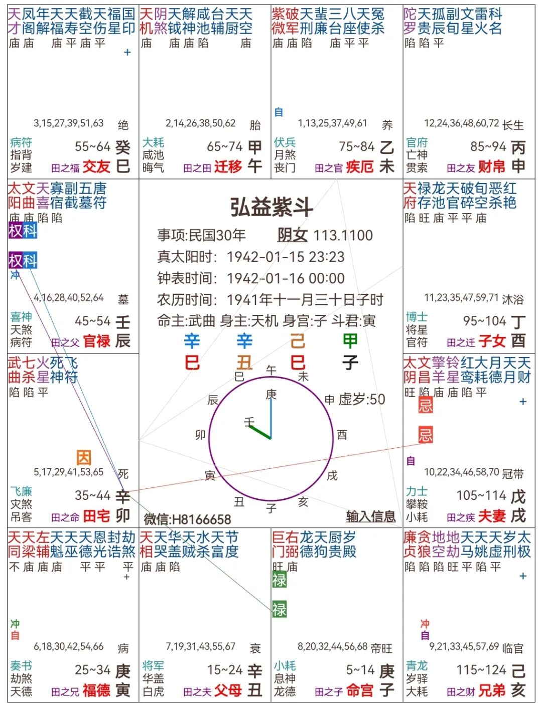 民国30年生,阴女,土五局,紫薇在未,命宫在子。科权禄三会命,吉处藏凶。