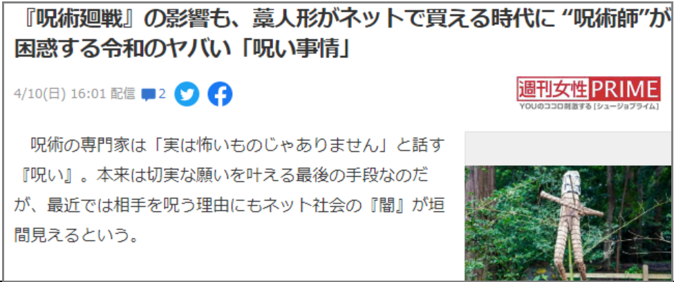 真新镇小茂 | 文前几天看到一个非常魔幻的新闻,说是随着动漫《咒术回战》爆火,日本关注现实中诅咒的年轻人越来越多,已经变成了一门可持续发展的生意。