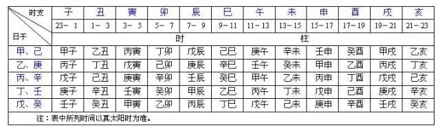 这个表格很多人不会看,我来解释一下:这个表格分时支和日干,时支即是十二时辰对应的地支,日干也就是日柱的天干。时支是固定的不变的,不同的日干对应不同的时柱。