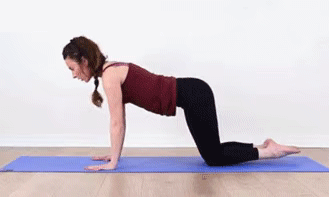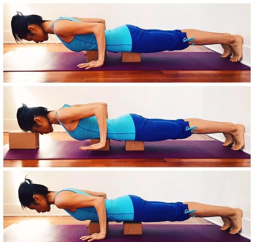 很多人以手在平板到四柱的转换过程中,身体是垂直向下的,其实你可以配合弯曲手肘的过程,让头颈带着脊柱稍微把重心向前移动一点点。试着在向下的过程中,屈手肘,手肘夹着肋骨向后拉,头颈带着脊柱向前走,重心也略微向前移动一点点。也就是说不是垂直向下,而是有向前向下滑行的感觉,当然这个向前的幅度很小,大家可以参照眼镜蛇或者上犬式中,头颈带着脊柱先向前的感觉。这样做还可以防止耸肩,避免肩颈紧张代偿。