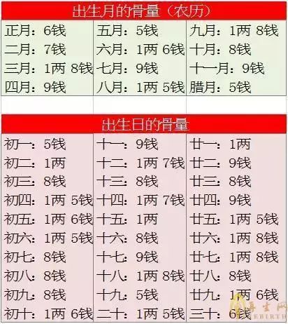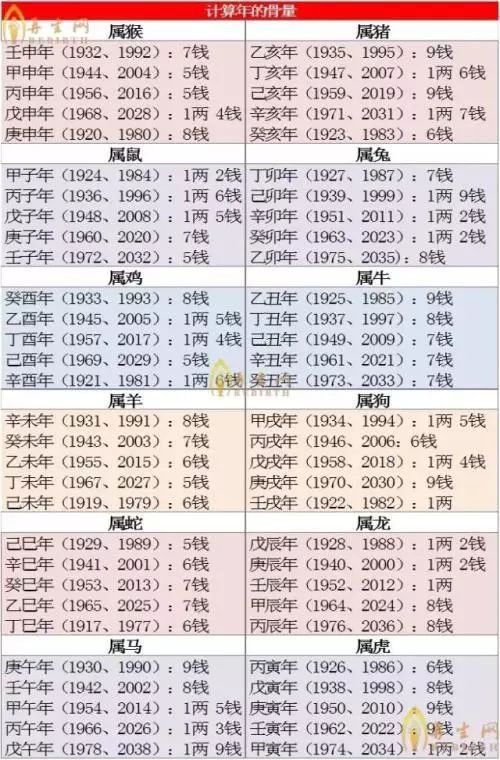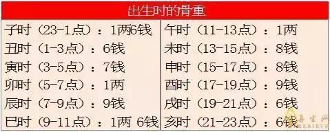 例如:你的生辰八字 1980年八月初六丑时 则年份1980:8钱+月份八月1两5+初六一两五+丑时:六钱最后相加得出4两4钱