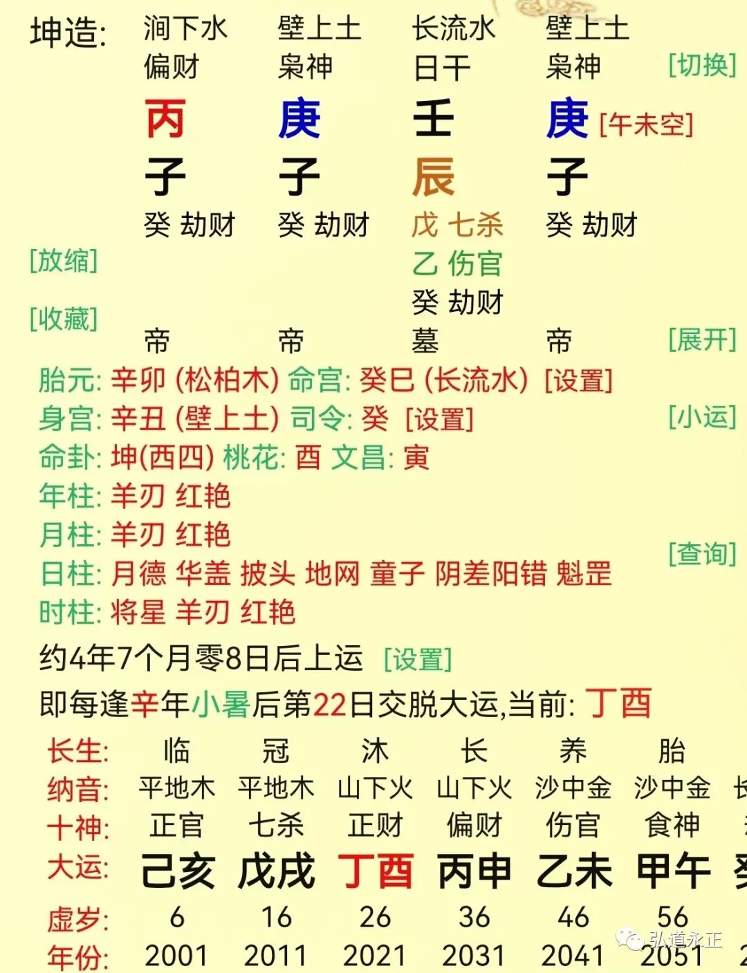 八字又属于纯阳命,天干地支都是阳的。这样的女性都有一个相当大方和阳刚的性格,做事光明磊落。有男人的性格。在婚姻上不好。八字纯阳的女性生活通常是孤独的,天生不服输,死要面子。 八字比劫星旺,比劫星代表同辈人如兄弟、姐妹、朋友等,这种八字暗示可得到同辈人的帮助,可以在做事上发展团队。 有没有财,看年干丙火正财星,丙火在地支无根,为虚透天干,虚透之财不代表钱财,可代表才华,代表头脑里有很多想法,要干一翻事业的心很强。 那能不能干成事,就要看所走的大运。2011年到2021走戊戌大运,为七杀运,八字为从格,喜金水,见木运也是可以的。但走土运,则不好,压力非常的大,大运与八字原局形成辰戌冲,与日柱天成天克地冲,则在这步运里会很波折,官杀混杂,则头脑不清醒,这会想干这,一会想干那,想干成很多事 来证明自己,但往往事以愿违。 在2021年到2031年丁酉大运,这步运不是很好,丁火克酉金,盖头运,下一步丙申运也如此,各方面都不如意。折腾来折腾去,也是落下个名声而以,不过有了好的人缘,也是一种成功。 46岁后走的大运还是不错的,食伤泄秀,中晚年好运的命。八字比劫星很旺,也是属于辛苦命,八字纯阳,羊刃为煞,婚姻是一个大的问题。实际命主学的服装设计,家里不有看好她在这个行业上能做出个名堂,命主一直边上学边在工厂打工,从实践中积累经验,毕业后要自己开设计工作室开始,但家里人还是不支持。这种命格得碰得头破血流才知道,人生也只有经历才丰富,俗话说,成功是从失败的经验中总结出来的。