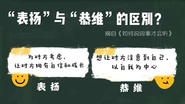 所以夸赞需要抓住重点,下面与你分享几个有效的表扬技巧。1、“表扬”和“恭维”的区别表扬是为对方考虑,可以让对方拥有自信,促进对方成长。而恭维的目的是想让对方注意到自己,是以自我为中心。切不可将二者混为一谈,要真心表扬对方。2、掌握时机在同事出色完成工。作或者立功时,立刻表扬对方。在恰当的时机受到表扬,不仅能够让对方更加高兴,还可以进一步调动对方配合你工作的积极性。3、对于平凡的小事也要提出表扬对于同事的基本精神面貌,也要提出表扬。比如他保持良好的仪容仪表,桌面保持整洁,每天精神十足地打招呼等。4、表扬脚踏实地的努力每个公司都有从事后勤工作的人。我们不仅要表扬取得优秀业绩的人,还要表扬在公司运行中发挥不可替代作用的默默努力的人。如果这个与你“八字不合”的同事是从事后勤工作的人,那你尤其要表扬他的努力。