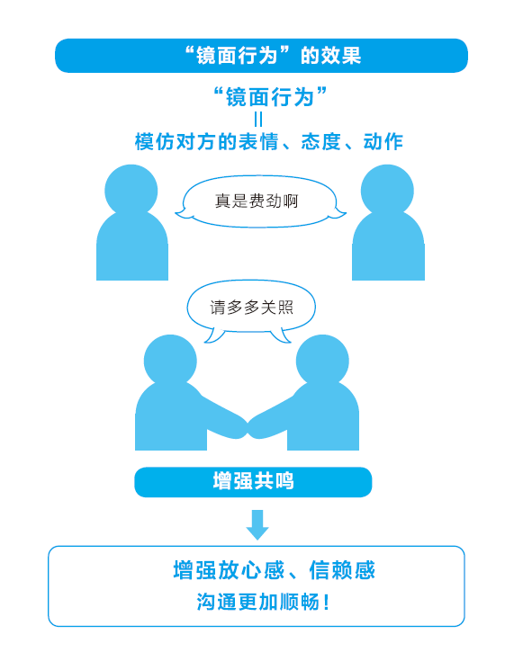 “镜面行为”是一种简单的沟通方法,它能够通过视觉信息直接地将共情传达给对方。所谓“镜面行为”,就是像镜子一样,模仿对方的表情和动作。通过“镜面行为”,感同身受的感觉就能够传达给对方,从而让对方放心。