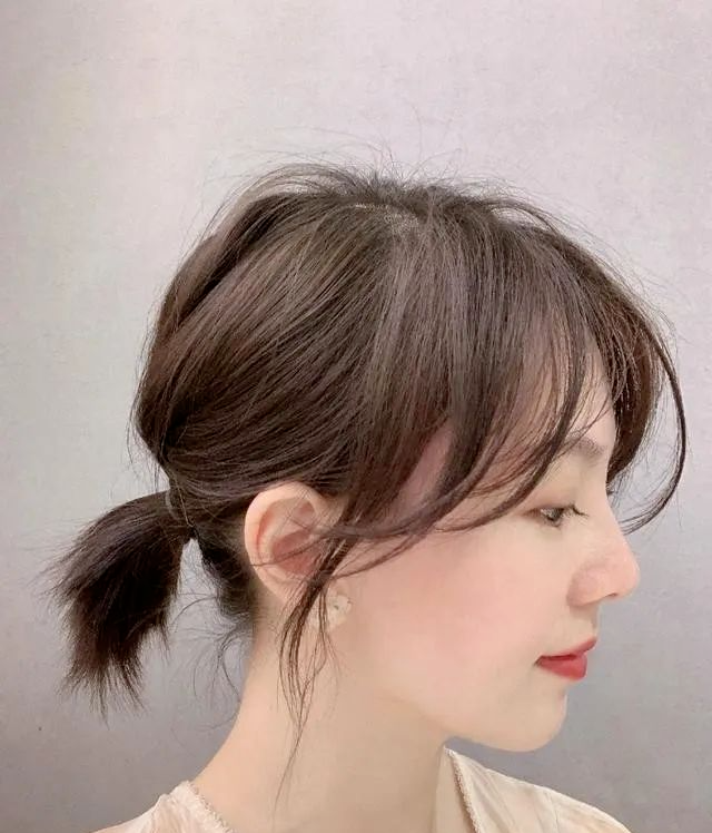 短发适当的扎起来会更美,这款低马尾短发发型,很显年轻气质,搭配八字刘海,很好的修饰脸型曲线,视觉上是巨显脸小,不挑人剪的万能刘海,你值得拥有哦!