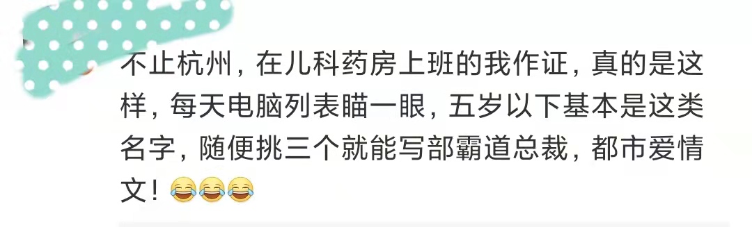 有儿科药房的药剂师吐槽:“真是如此!每天电脑列表瞄一眼,5岁以下孩子的名字随便选三个,都能写一部霸道总裁、都市爱情文!”
