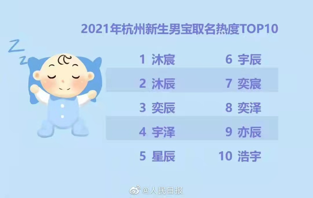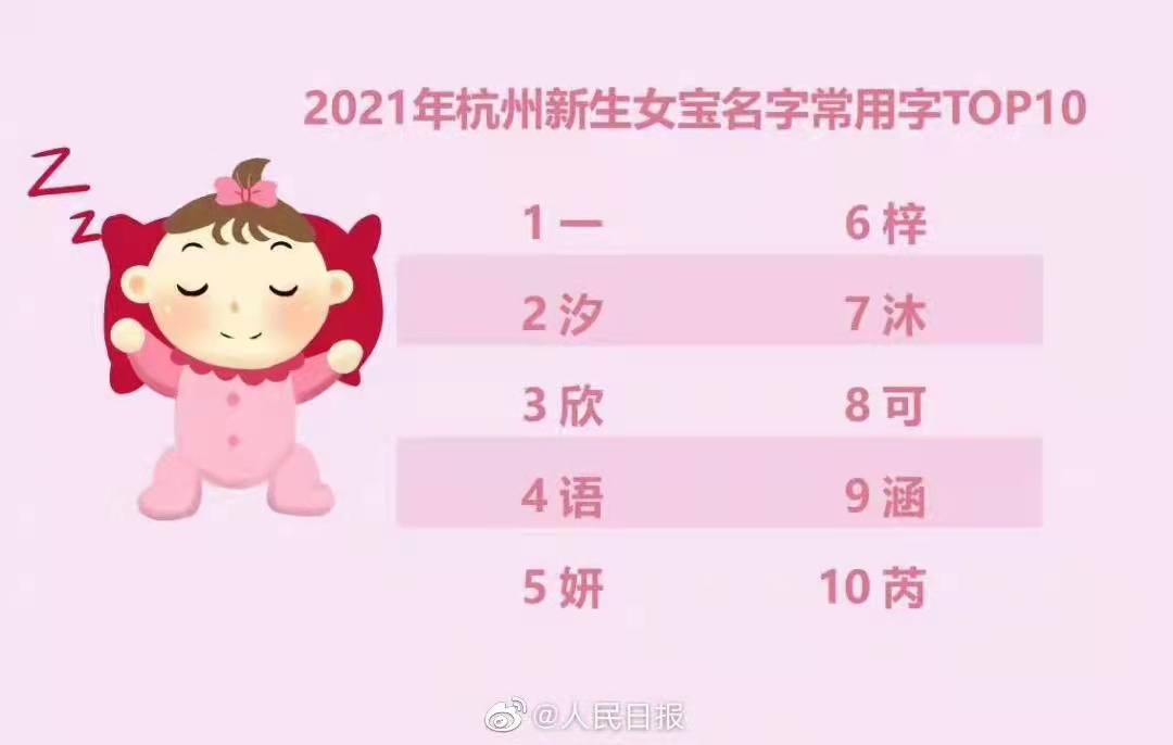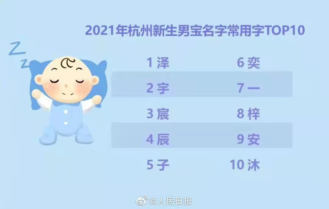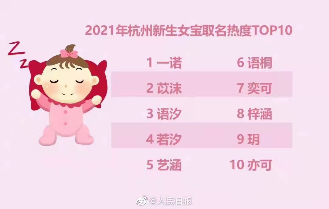 浙江省杭州市公安局公布了2021年杭州新生儿“爆款”名字。