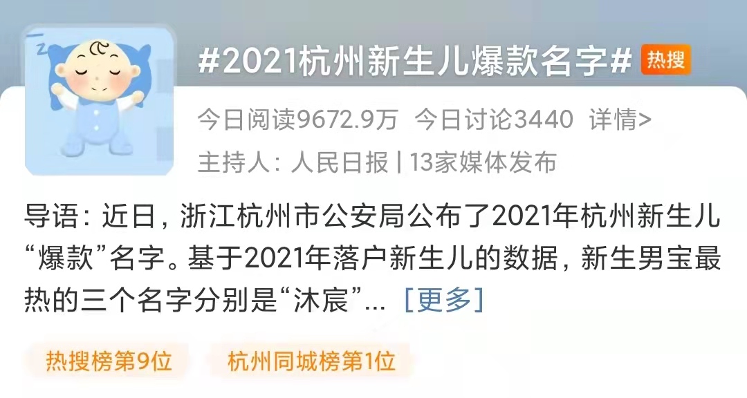 2021杭州新生儿“爆款”名字被公布,也上了热搜榜!我无比忧伤地把帖子转给老公,我家两个孩子的名字都名列其中。