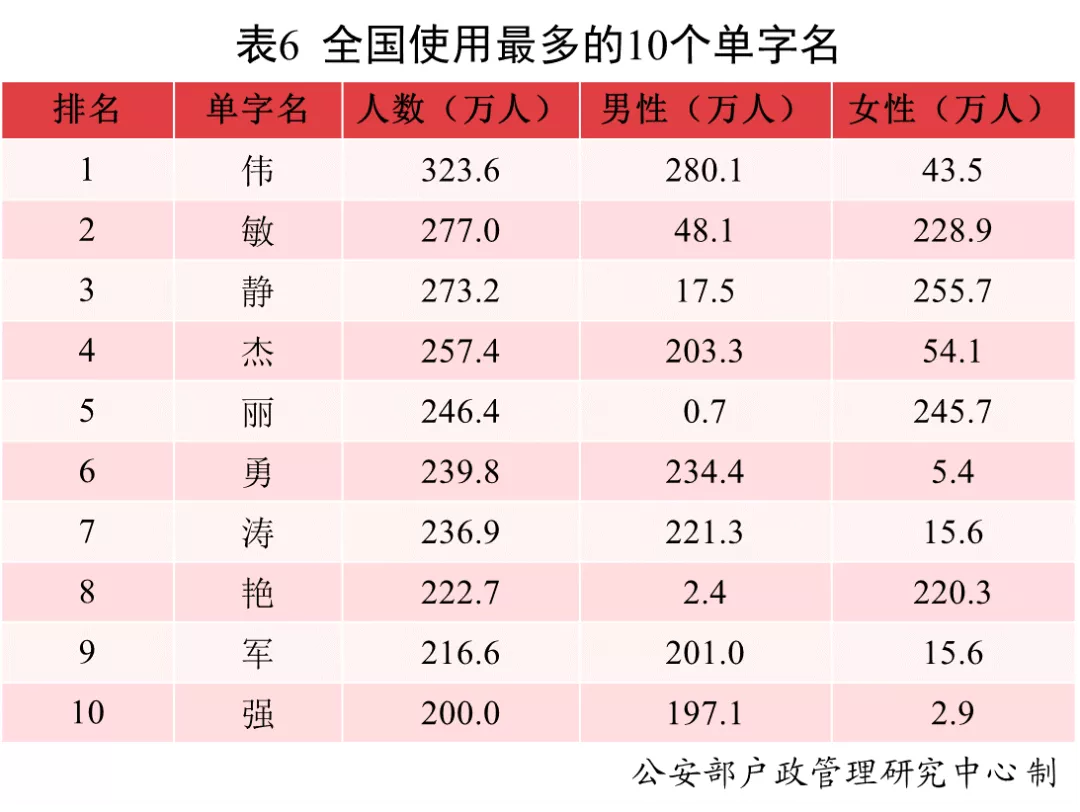 全国使用最多的10个单名字和10个双名字还是有50、60、70、80年代的影子:伟、敏、静、杰、丽、勇、涛、艳、军、强,稍微想想,你自己或者周围同学、同事、朋友、家人,肯定都有过这些名字!