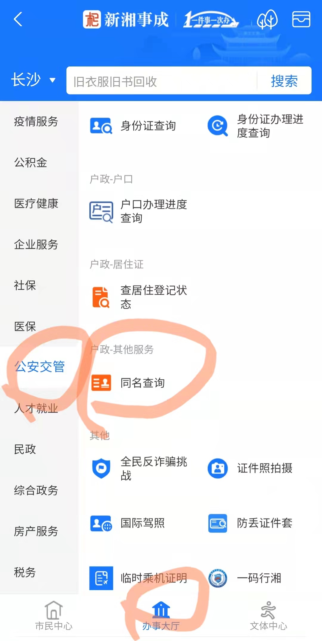点击下方“办事大厅”——“公安交管”——“户政-其他服务”——“同名查询”。