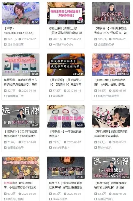 在B站上,“你的正缘什么时候出现?”“你的对象颜值多少分?”“你会和谁结婚?”“有人暗恋你吗?这个人对你而言是烂桃花吗?”各类塔罗牌占卜视频层出不穷。