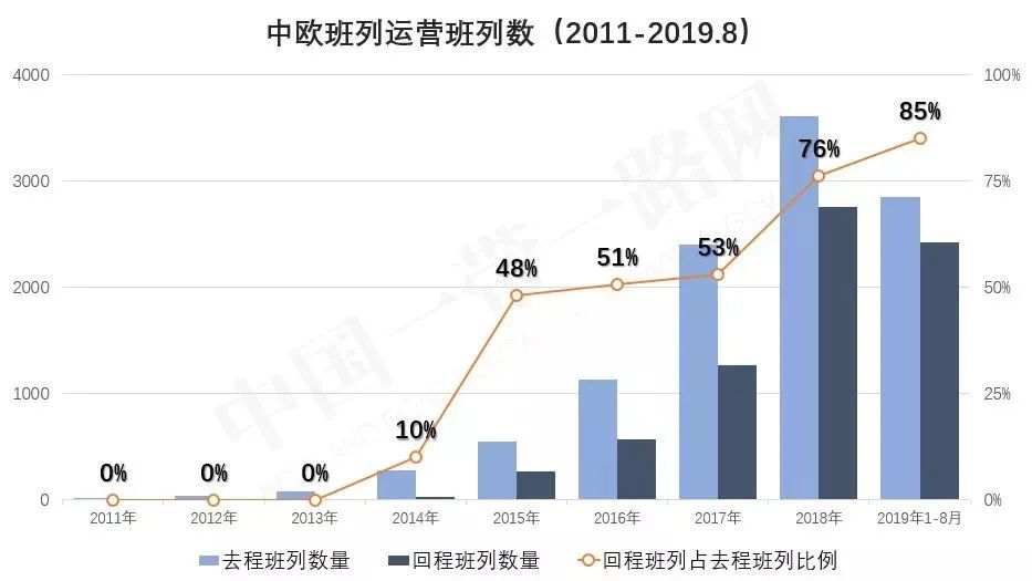 2018年之前,中欧班列几乎年年都是100%+地迅猛增长。