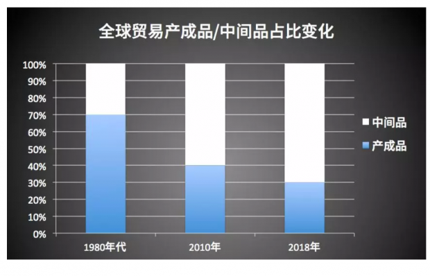 到了2018年,形势完全对调过来,全球贸易中已有70%属于中间品,只有30%属于产成品。