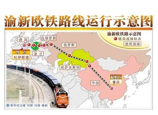 他灵光一现,想到了中欧跨境铁路,于是拿着红笔在地图上画了起来:陇海铁路、兰新铁路、北疆铁路,由阿拉山口出境,再经哈萨克斯坦、俄罗斯、波兰到德国。重庆能不能把这条铁路线利用起来呢?