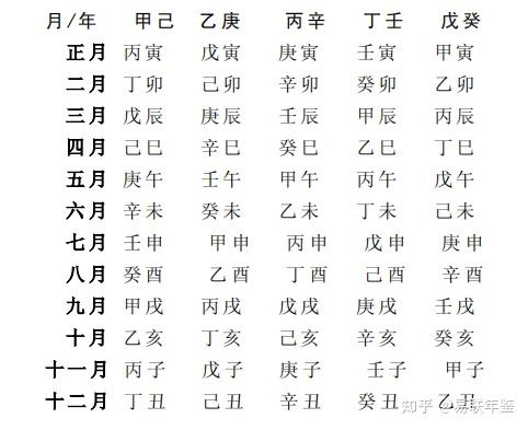 △五虎遁年起月诀:甲己之年丙作首,乙庚之年戊为头。丙辛之岁寻庚土,丁壬壬寅顺水流。若问戊癸何处起,甲寅之上好追求。