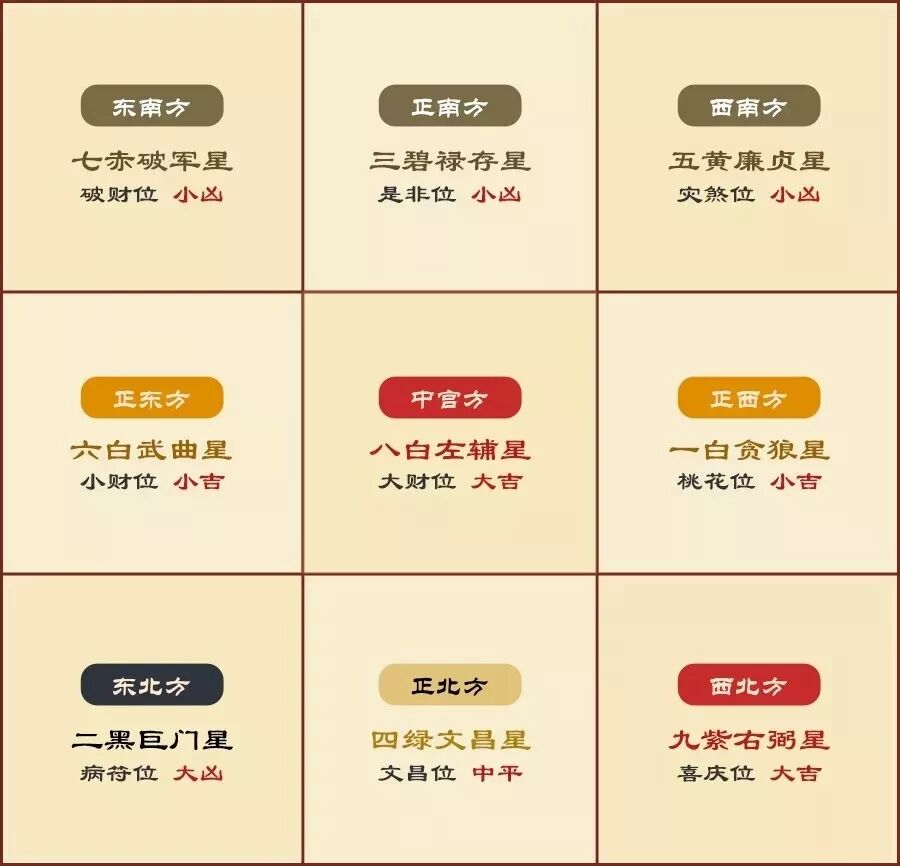 己亥流年,九紫星主婚庆在西北方,一白贪狼星主桃花在正西方,这两吉星虽然并非当时得令,但仍会带来一些财运,去这两方位可增强人缘和桃花运。