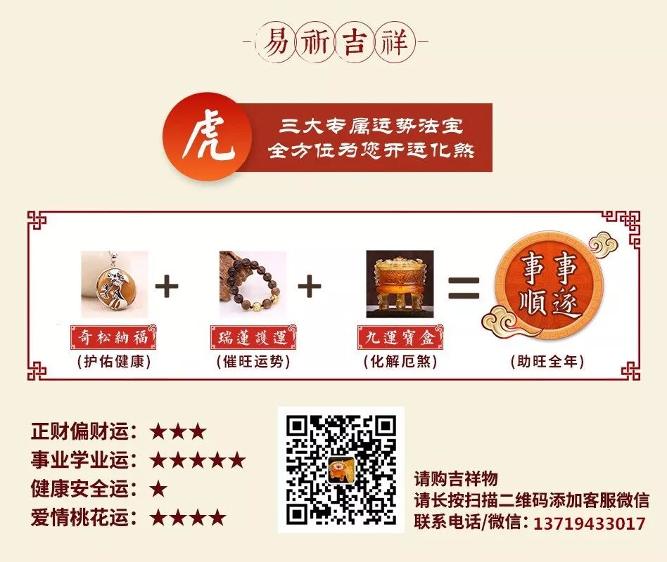 今年受多颗与平安健康有关的煞曜牵动,属虎人要格外注意预防无妄之灾,出门在外,无论出差还是旅行,要时刻注意人身安全,注意避免意外事故。危险活动和极限运动之类能避则避,今年不宜探病问丧,以防沾染不利的气场。此外今年是生肖虎辛苦得财之年,工作压力不小,又有宵小搅局,再加上“孤神”煞曜的影响,倒霉之事常有,容易心情烦闷,身心倦怠。若想要全年无病无痛,身心愉悦,建议佩戴“奇松纳福”开运物,让负磁场一扫而空,持盈保泰。