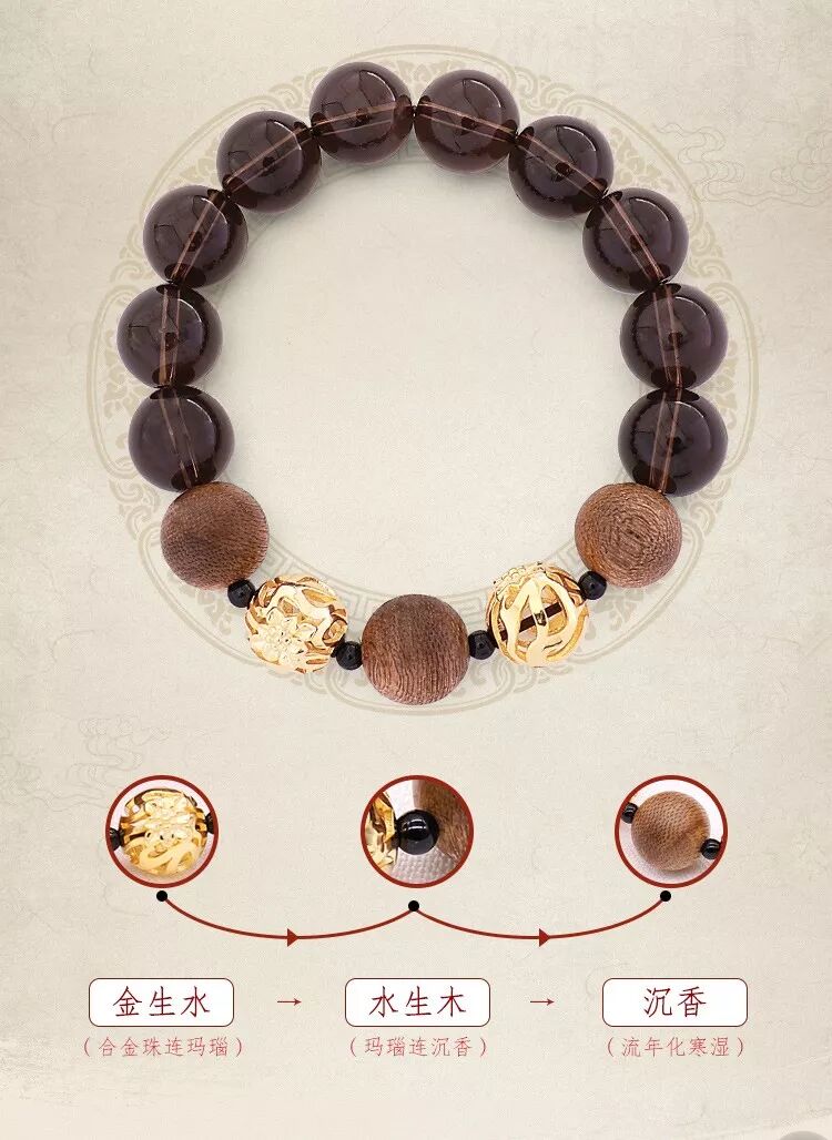沉香旺运手链的材质组合,不仅实用美观,沉稳大气、时尚百搭,更暗藏旺运解厄之玄机,合金珠五行属金,黑玛瑙与茶水晶五行属水,沉香属木,形成金生水、水生木,使流年干支庚子金水之气得木疏解,流通有情,岁运趋吉,生机焕发。若贴身佩戴,可增吉祥喜气、旺运,助佑福主如意吉祥,非常值得入手。