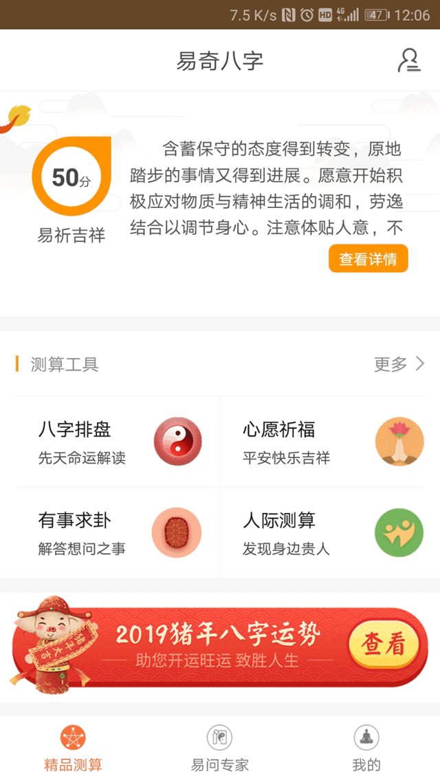 2019年亥寅为六合,但寅中的丙火被亥中的壬水克制,产生不和谐因素,所以被理解为破太岁。属虎人本年须防小人破坏、失财、感情破裂之事,也容易有吃力不讨好之感,如果忌神为木尤为明显,可参考下图使用易奇八字APP查看自己的忌神。
