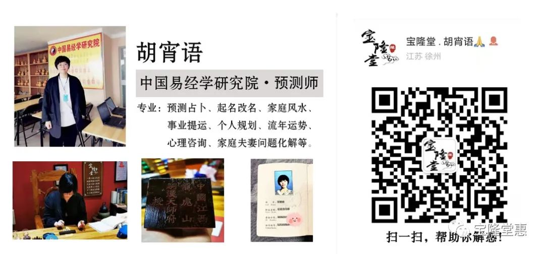 宝隆堂•胡宵语—中国易经学研究院预测师,因为专业,所以卓越,精诚为您服务!主:居家风水(各种风水)、化解太岁、合婚订婚、预测占卜、心理咨询、姓名起名改名、流年运势、家庭夫妻问题化解、事业提运、个人规划、企业用人合作、亲自教育心理健康咨询、家庭风水、数易文化......等,如有需要,请随时联系我的老师如果您还没关注,还请扫码关注一下凹!谢谢