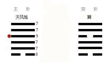 如上图,我们求得六个商数分别为:7、7、9、7、7、8,也就是天风姤卦,其中四爻变,9为老阳,要变成阴;则变卦就是巽卦。这个连在一起称之为:姤之巽卦。