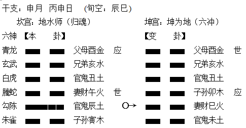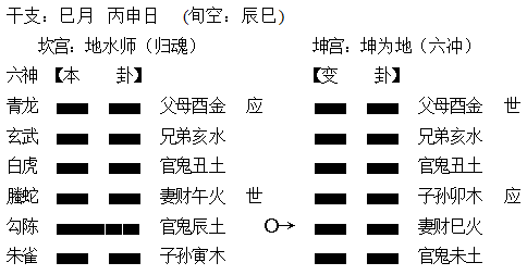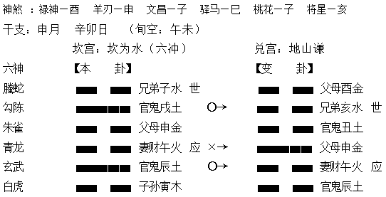 第二步:吉凶判断。动必有因,卦中火动来克金,子孙爻午火发动使酉金受伤,克世爻兼且克用神之官,很明显可以定性为凶兆了。原注中有人说应爻生世爻所以有救,但他不明白,卦机之关键在于动兆,应爻戌土不发动,如何能生世爻?只是表面架势而已,并不能改变大局的定性。为何是大凶?动克之余,世爻官鬼酉金又遭月破日克,已见墙倒众人推,屋檐破了偏遇见连绵夜雨——— 真正倒霉透了。