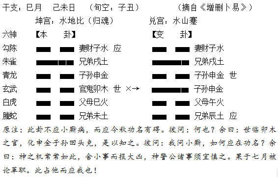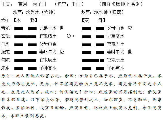 从原注描述中了解到,事主因为与某人结怨,怕被某人陷害而占卜。结果卦象显示,官鬼戌土发动克伤世爻子水,此事预期大凶。细节解剖就能发见,原来仇家正在怂恿某人暗地里策划谋害事主,对于这个不利的事件趋势,作者根据卦象信息,遂教导事主化解之策,建议他直接去找到这个准备加害他的某人,向他摊牌申明助敌的利害关系,事主立刻照办,结果某人受警告后知难而退了,卦象凶兆的未来就此被彻底瓦解。