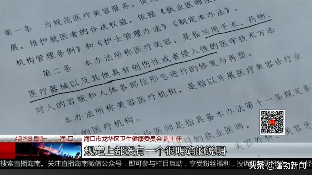 海口市龙华区卫生健康委员会 副主任:纹眉是属于生活美容还是属于医疗美容,这个情况,我们也查询了很多文件资料,包括一些规定,规定上都没有一个很明确的说明,我们也向上级主管部门做了一个请示。关于消费者投诉的这个事情,我们已经到了现场进行调查了解,也搜集了相关材料证据,下一步我们将根据结合上级的答复情况,做出进一步的处理。