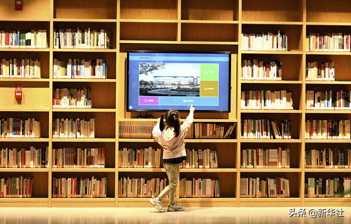 小朋友在位于正定新区的石家庄市图书馆新馆使用电子屏查阅书籍(2021年10月5日摄)。新华社发(许建园摄)