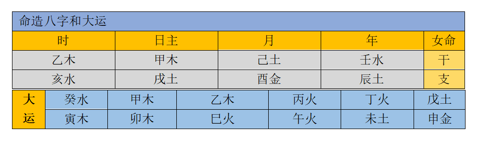 八字出来后,首先要找到出生日的天干(也叫日主,日干)是什么,因为它就代表了你自己属什么命,例如下面例子,出生日是甲戌,上面的甲木就是出生日的天干,代表属甲木命,也叫甲木日主,甲木日干等。现将十天干五行属性列出来:甲 、乙属木, 丙 、丁属火, 戊 、己属土, 庚、 辛属金, 壬、 癸属水。