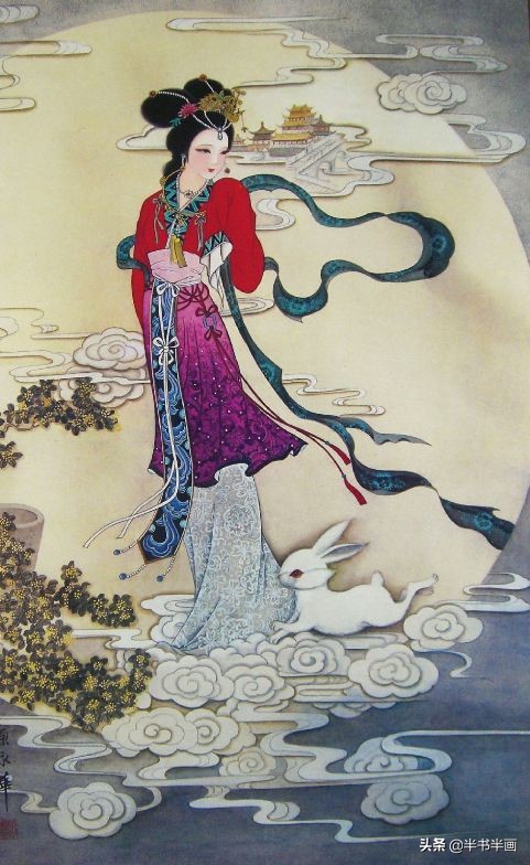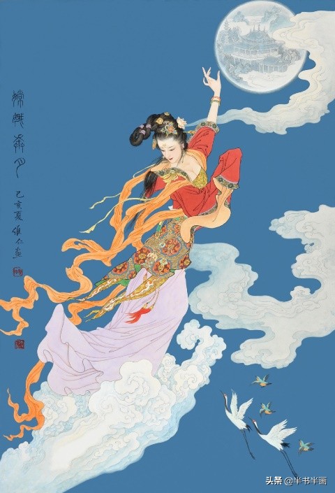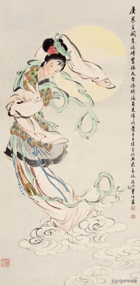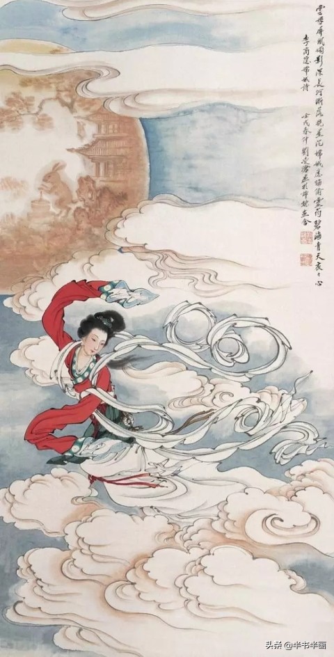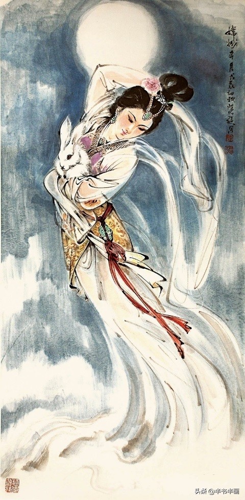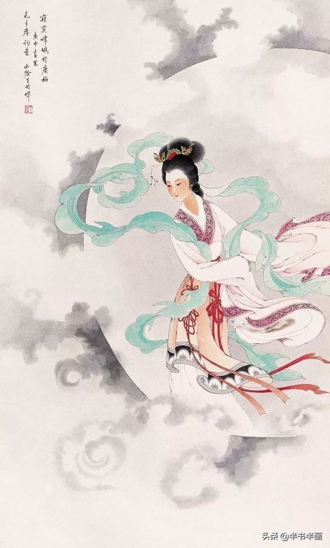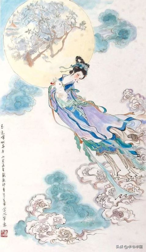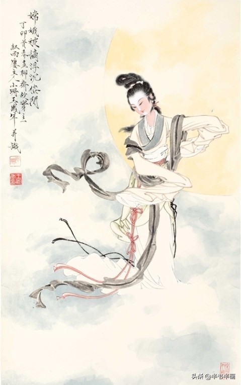 华三川的两幅嫦娥气质不同,上图为早期风格,可看出线描功力,下图画风成熟飘逸。