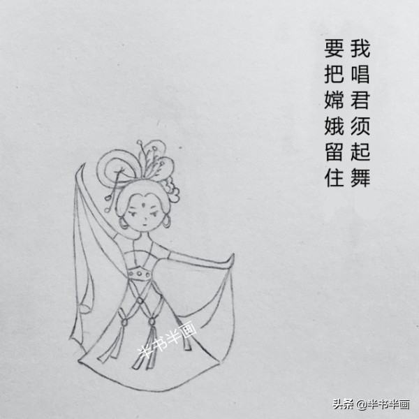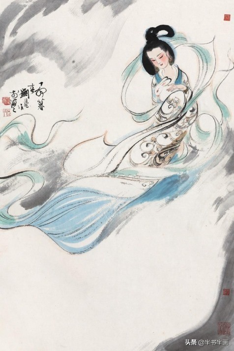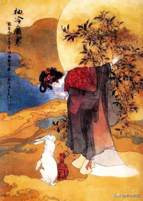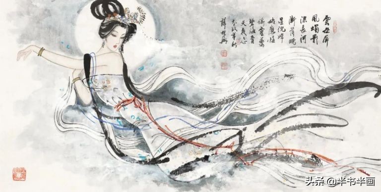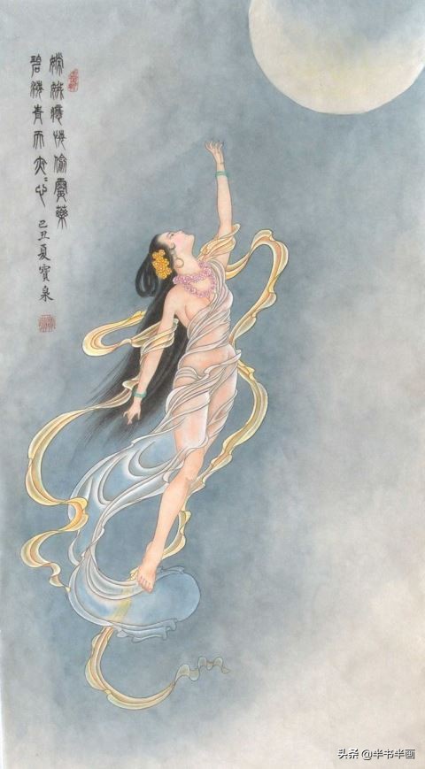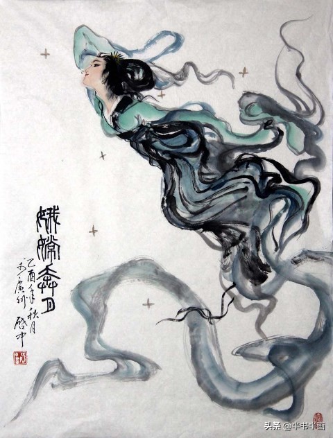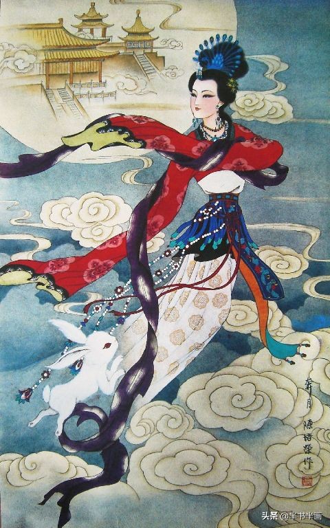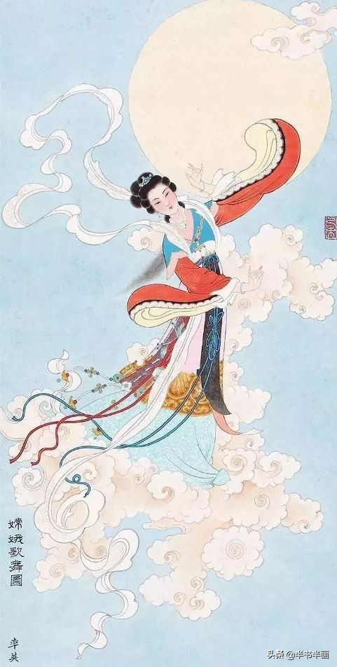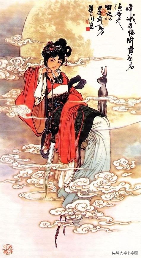 华三川的两幅嫦娥气质不同,上图为早期风格,可看出线描功力,下图画风成熟飘逸。