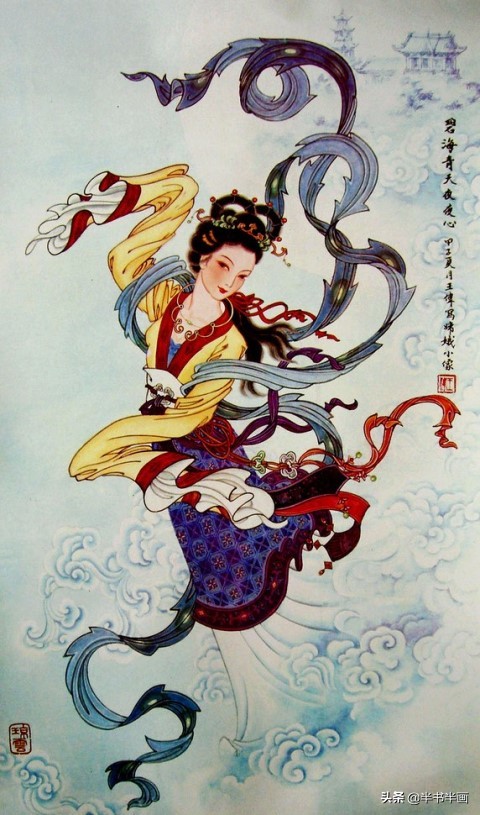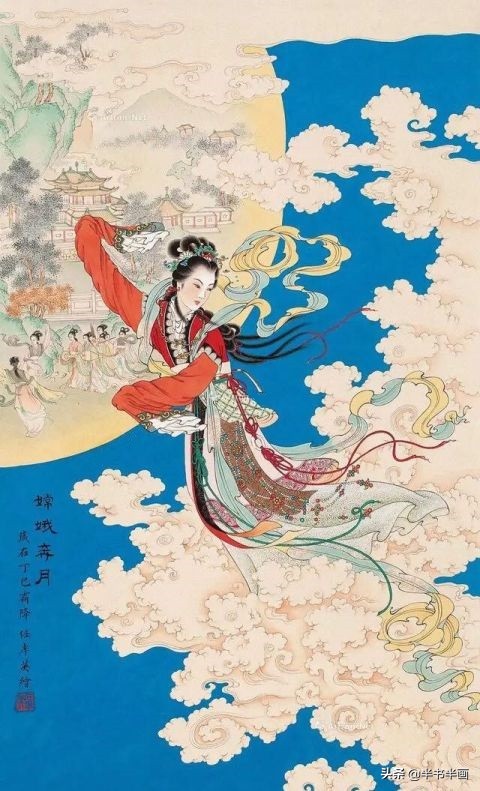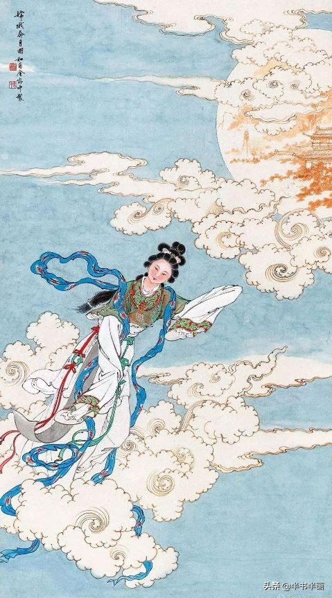 如果没有远景的月宫,这幅嫦娥大概率会被认成凌波仙子。嫦娥脚下云海翻腾,连头上的饰品都像龙宫水族之物。