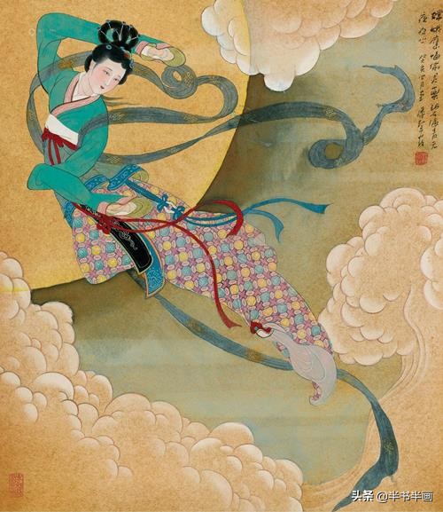 中国画和西方绘画一样讲究文化意象,国画中的传统题材都有各自的文化符号。女子骑着马(或骆驼),在风雪中怀抱琵琶,这是昭君出塞。女子骑着马(或毛驴),身边有个满脸胡须的黑大汉,这是钟馗嫁妹。捧着桃子的仙女是麻姑献寿,举着花篮的仙女是天女散花,在空中摆出瑜伽姿势跳舞的是飞天。背景里有月亮的不一定是嫦娥(也可能是拜月的貂蝉),但奔着月亮飞、兔子作道具的那一定是嫦娥。