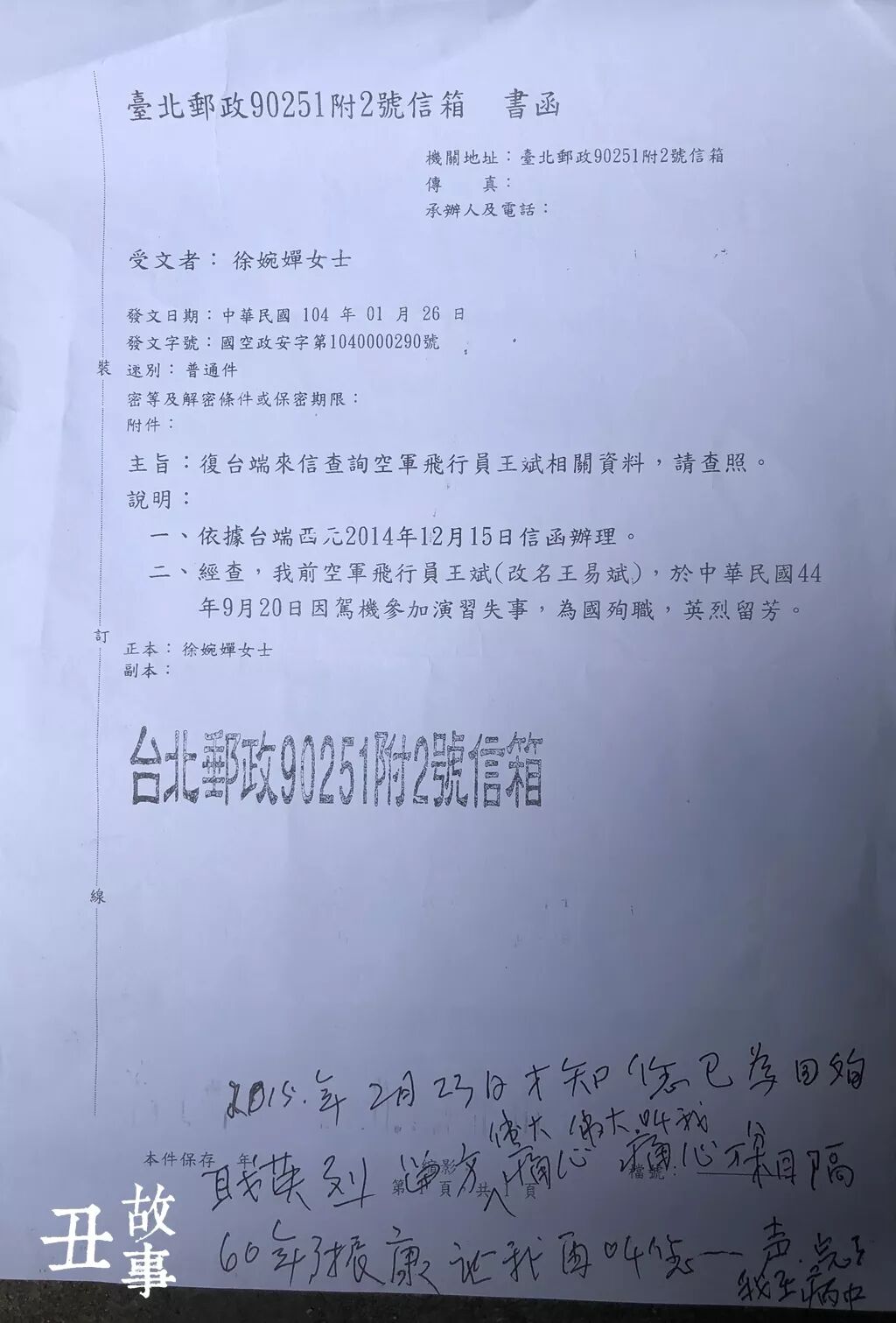 没想到,一个多月后,2015年年初,竟然收到了一封台湾“国空安抚局”的回信。