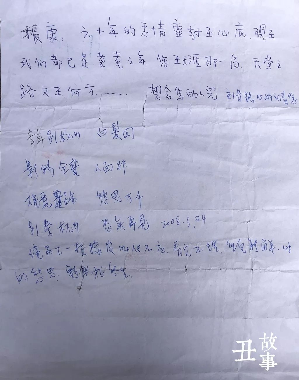 2008年杭州看病归来,她在一张纸的背面写下两段文字: