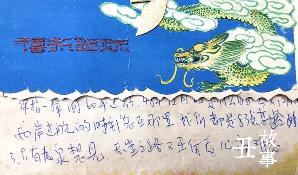 贺卡的封面,是蓝色的天空背景上,一条金色的龙腾云盘旋。就像驾着战机翱翔蓝色天空的他。