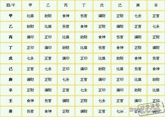 2、日干与它干成同性生克同类之关系为“偏”,其中有偏印、比肩、食神、偏财、偏官。比如,日干为甲木,则壬水为甲木之偏印、甲木为甲木之比肩、丙火为甲木之食神、戊土为甲木之偏财、庚金为甲木之偏官,等等。