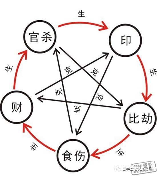2、十神之间的相克关系:官杀克比劫、比劫克财星、财星克枭印、枭印克食伤、食伤克官杀。