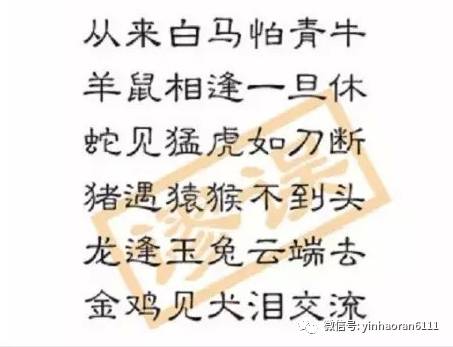 其实,属相只是八字中的一个字,也即“年支”,所有生于某年的人年支都是一样的。民间为了便于区分和表述一个人的年龄,往往用生肖来代替地支,12个地支正好对应12个属相,那么,上述口诀的依据又是什么呢?