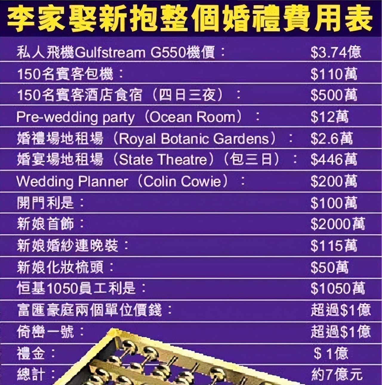 如此奢华的婚礼,李兆基则表示,不在乎这点小钱,更是放言:“这点钱我一天就能赚到。”