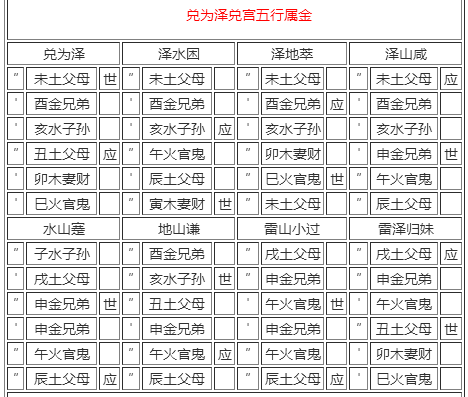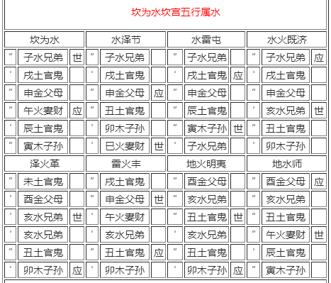 这就是周易64卦,每个卦摆头的字词就是卦名,大家看到每一个卦象都有六个一横或两横的符号,那就叫“爻”,每一卦都有六个爻构成,一横的叫做阳爻,两横的叫做阴爻,每一爻的左首边都有金木水火土的字样,那叫“五行”;再往左的子丑寅卯等字样,叫做“地支”;再往左的那些子孙、妻财、官鬼等词组,这叫做“六亲”;而符号的右首边有两个世应的字,旁边有世字的,这个符号是代表摇卦人自身,叫“世爻”;旁边有应字的,这个符号是代表摇卦人所问的事情,叫“应爻”。那如何通过上述八卦全图的信息占卜事情祸福呢?方法就是:通过自己手工摇卦及排出卦象后,直接将卦象按照八卦全图的指示,套上相应的六亲与世应,看在卦的世爻位置上是什么六亲,此称为“x x持世”,如排出的卦是水泽节卦,按八卦宫全图套上,世爻是妻财巳火,就称为妻财持世。直接根据什么爻持世,来判断未来的吉凶祸福的方法,叫“装卦持世法”。