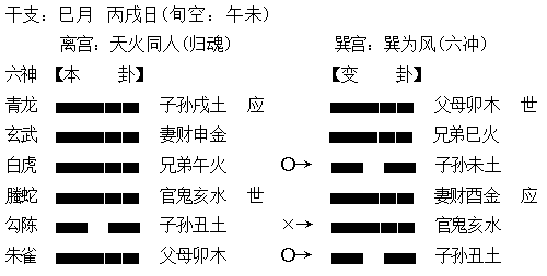 (2)占问功名、事业之事。人生在世,绝大部分人看重的无非就是功名与利禄,能够鱼与熊掌兼得自然最为理想,退一步能得其中之一,也算不枉此生。事业方向的吉凶趋势也可通过自己占卜来知晓。例如问事业与仕途运程、官位得失、聘职成败、升迁与否、考取公务员等等求功名之问,若卦象占得官鬼持世,望升即升、候选即选、竞聘必中取、怠误者官职犹存、罢黜者前程可复;相反若卦象占得子孙持世,仕途坑洼、功名难求、被废者难蒙起用。而卦有一事一测之功,非终身定数,不幸占得子孙持世虽然此遭失望,待逢机缘适合,仍可以就事再占。如一不懂易者巳月丙戌日欲自占自解官职竞聘,得“同人之巽”卦