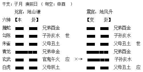 (1)占问忧患之事、喜厌之事。人无远虑必有近忧,一个人出现令自己担忧非常的事情很正常,有些忧虑甚至可令人茶饭不思、彷徨无计,遇到这些事情其实可以为自己卜上一卦。如问事是否祸及于已、是否受牵连于是非、担心被拖累与否、狐疑事之损益、忧患行事之吉凶、忧虑担心趋势、主观喜厌之事的趋势等等,忧患终日压于心头之问,都可以这样占。若卦象占得子孙持世,则放心欢喜、稳如泰山、当行则行,忧患担心化于无形,有吉无凶;若卦象占得官鬼持世,则惊惶将显、忧患难解、厌恶坐实、是非重重,欲行应止谨慎从事。如不懂易之某翁于子月庚辰日自占自解,女与婿外埠旅游平安否,得“谦之升”卦