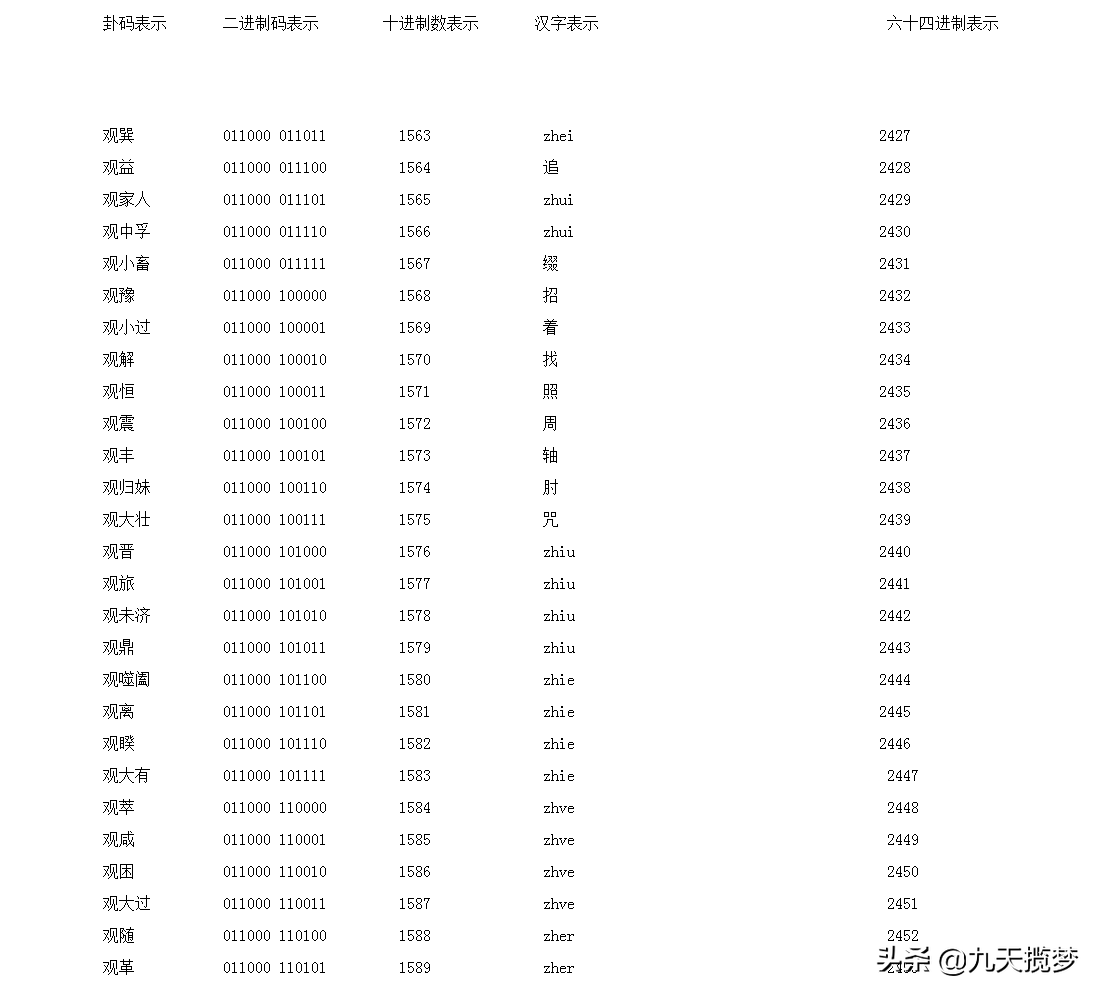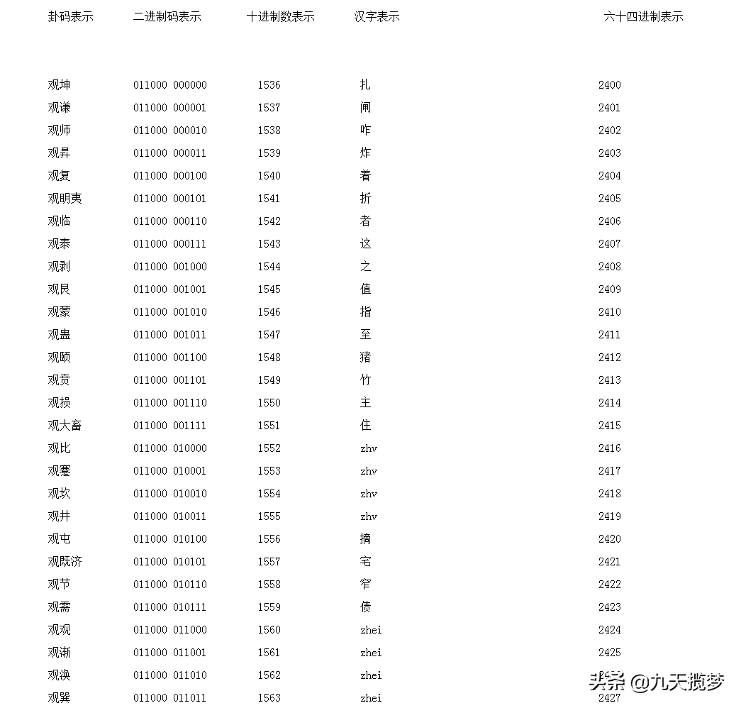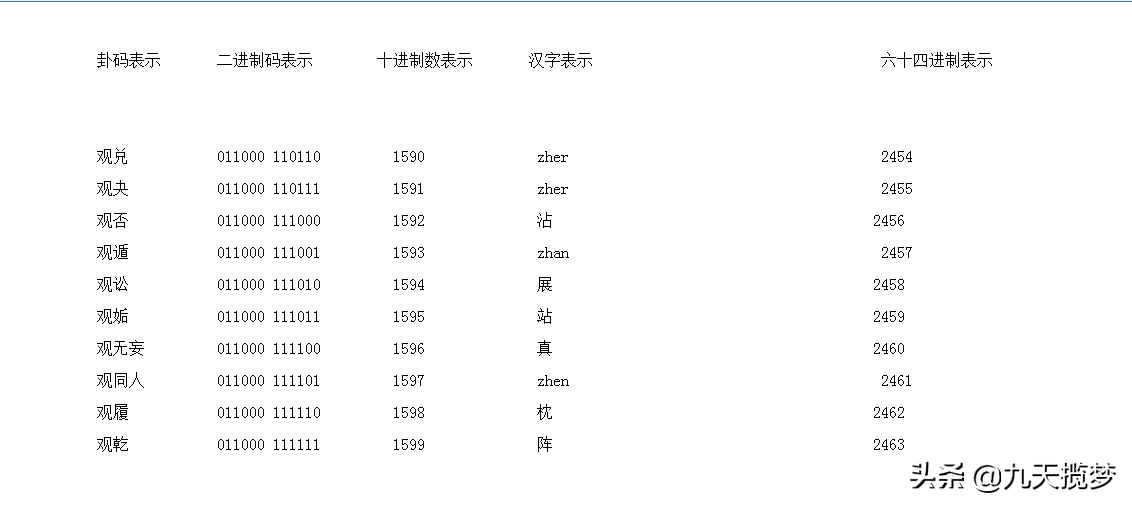 二进制数从左向右排列,正好是十进制的24,这样有利于直观的转化,所以我们这样排卦,而传统的64卦观卦是第20卦,下坤上巽,从下往上读爻“”=3(十进制数)了,这里与我们现在的读写习惯相反,所以我做了一点改动,这里添加说明