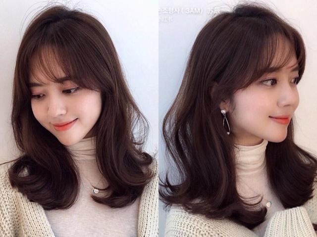 4、很美的韩式八字刘海+披肩发,而且还是今年很流行的气垫烫发型,采用了烫发的技术,把发尾卷成了很美的鱼尾形状,超级修饰脸庞的,衬托出很美的脸型,有点轻微的层次蓬松感,自然又不失可爱,搭配黑茶发色,一样是很显肤色白。