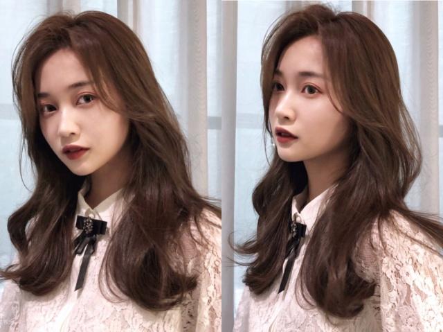 3、春季来了,很多女生都要换上一个很应季节的发型,把长长的刘海修成了八字的龙须刘海了,瘦脸的效果非常好,可甜可盐的披肩发,可以甜美,也可以优雅,十分的随性,染上很梨木发色,偏暖调的棕色,好显白的,这样的发型非常的韩系风,美极了。