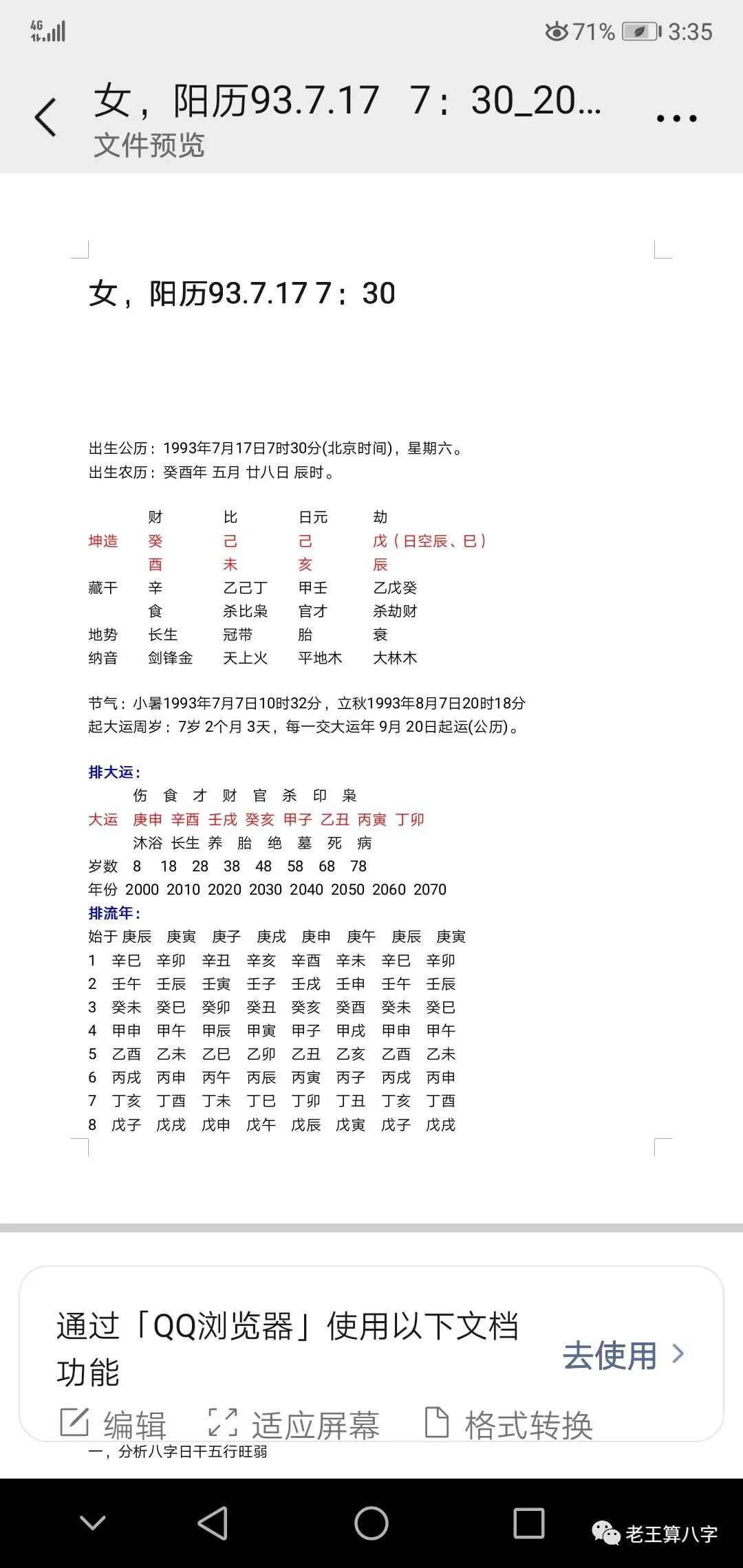 一,分析八字日干五行旺弱日干为己土代表命主,生在夏末未土月令,月令土旺,故命主八字身旺。八字讲究五行平衡,身旺需要抑制,金水木能够抑制日干己土,故金水木为用神。身旺不喜再逢生扶,火土能生扶日干己土,故火土为忌神。二,分析事业财运命主八字身旺,身旺则有担财官能力,财星代表钱财和经济,官星代表事业和工作。官星五行为木,八字身旺土厚,需要有木克土,官星克身平衡八字,但是命主八字五行没有木,缺少官星,故而会影响到命主未来事业的发展。官星又代表官职官位,命主八字没有官星,故未来不太适合走仕途,没有官运。水为财星,命主八字身旺也喜财星耗身平衡八字,八字年上有癸水财星坐酉金逢生而旺,财星为用神而有力,发挥了很好的作用,所以未来更适合从事与经济有关的工作行业,将会对你非常有利。癸水财星坐了酉金,酉金为食神,食神代表技术技能才华等,食神生财,故命主未来靠技术技能才华等去追求事业或靠技术技能去赚钱,会更好。日支亥水为正财,代表劳动收入,也代表稳定的收入。亥水为驿马,驿马代表动,也代表国外,八字身旺喜亥水财星耗身,故亥水为用神。但是亥水被月令未土和时支辰土所克,财星为用神,不喜被克,亥水又是驿马,驿马被克,则不适合旅居海外,所以命主更适合回国发展。水为财星,为用神,水代表北方,故首选祖国的首都会最好。八字身旺土厚,也喜木旺克土平衡八字,木旺东方,上海为东方,故上海也是不错的选则。八字身旺土厚,忌火旺再来生身助旺忌神,故不适合去火旺的城市,南方火旺,故不要去祖国的南方一些城市发展。命主八字财星发挥了很好的作用,且大运又助旺财星,所以命主只要好好努力积极大胆去追求,未来实现中产阶层也不会有什么大问题。三,分析大运运势28-38岁走壬戌大运,壬水为财星代表钱财和经济,八字身旺喜见财星,但壬水坐戌土,戌土为比劫,财星被比劫所克,不利事业工作及财运发展,且运支戌土比劫为忌神,有夺财之患,也不利事业工作及财运发展,所以这个大运运势平平,因此命主就要合理规划安排,谨慎行事,保持平稳向前发展会对你更有利。38-48岁走癸亥大运,为天干地支一气水旺的大运,水旺财星也旺,命主八字身旺有担财能力,最喜见财星,故命主在这个大运里事业工作及财运方面运势都会很好,故要好好把握,积极努力大胆去追求,就一定会有很好的收获。48-58岁走甲子大运,为水木旺的大运,水为财星,木为官星,水木旺则财官旺,命主八字身旺有能力担财官,所以命主在这个大运事业工作及财运会更好,所以一定要好好珍惜和把握,争取在这个大运里,使事业工作及财运再有一个新的突破。58-68岁走乙丑大运,丑土助身本为忌神,但是被大运乙木所克,忌神有制,故这个大运事业工作及财运方面也会很好,只要有追求,就一定会有收获。68-78岁走丙寅大运,木旺克土,平衡八字,晚年走用神大运,则说明命主晚年身体健康,精神焕发,能享晚年之福。四,分析近期流年运势今年是壬寅流年,为水木旺的流年,水为财星,木为官杀,八字身旺喜水木克身,说明命主今年事业工作及财运方面运势比较好,所以命主今年一定要好好抓住机遇,积极努力去追求,就一定会有很好的收获。明年是癸卯流年,也是水木旺,财官旺的流年,也很利事业工作及财运,所以命主在这个二年里就要积极努力大胆去干,如理如法积极努力去打拼,这年定会有业绩出现。2024年是甲辰流年,辰土本为忌神,但被甲木所克,为忌神受制,也很利事业工作及财运发展,所以就要积极努力大胆去干,只要有所求,就一定会有收获。2025年是乙巳流年,为火旺的流年,八字本身就旺,不喜见火再来生身,使八字失去平衡,不利事业工作及财运发展,所以命主在这年就要谨慎行事,合理规划安排,切忌贪欲贪求,否则会有破财之患。2026年是丙午流年,为天干地支一气火旺的流年,火旺八字更旺,更不利事业工作及财运发展,所以命主就要脚踏实地,一步一个脚印稳步向前发展会对你更有利,切忌贪欲贪求,强求和冒进,对你非常不利。总之,从命主八字原局来看,非常适合回国发展事业,不要留在国外,在外不符合你的八字命理组合,只有回到国内发展才是正道。根据你的八字来看,到北京或上海一些城市对你发展会更有利。从大运运势来看,除28-38岁运势平平,38岁后一马平川,所以命主就要好好珍惜和把握,积极努力奋斗,未来成为中产阶层不成问题。从近期流年运势来看,头三年运势较好,所以一定要把握好,后二年运势平平,但只要在前面的基础上保持平稳发展就好。