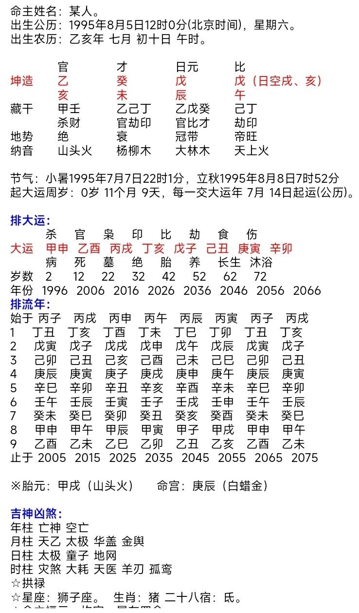坤造:乙亥年,癸未月,戊辰日,戊午时(戌亥空)